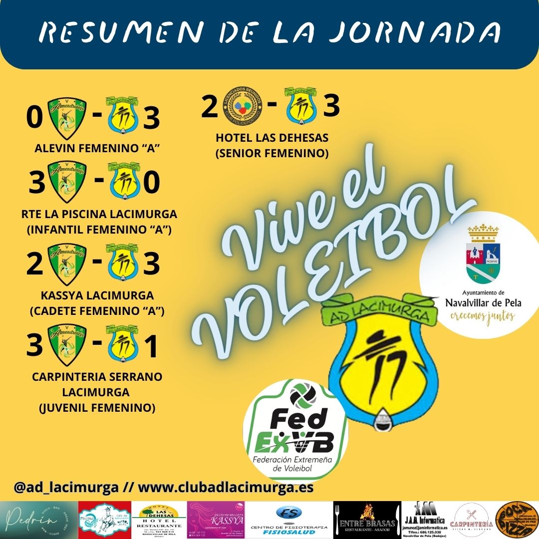 El sábado, nuestros equipos de 1ª división viajaron a Almendralejo para competir contra CVB ALMENDRALEJO donde tuvimos de todo... en categoría Alevin nuestro Alevin femenino A superaba al conjunto local por un importante 0-3, en el caso de nuestros equipos RTE LA PISCINA LACIMURGA Y CARPINTERIA SERRANO LACIMURGA no supimos doblegar los encuentros cayendo por 3-0 y 3-1, y en el caso del equipo KASSYA LACIMURGA nos alzábamos con la victoria por un apretado 2-3, remontando un 2-0, partido de los que hacen afición.