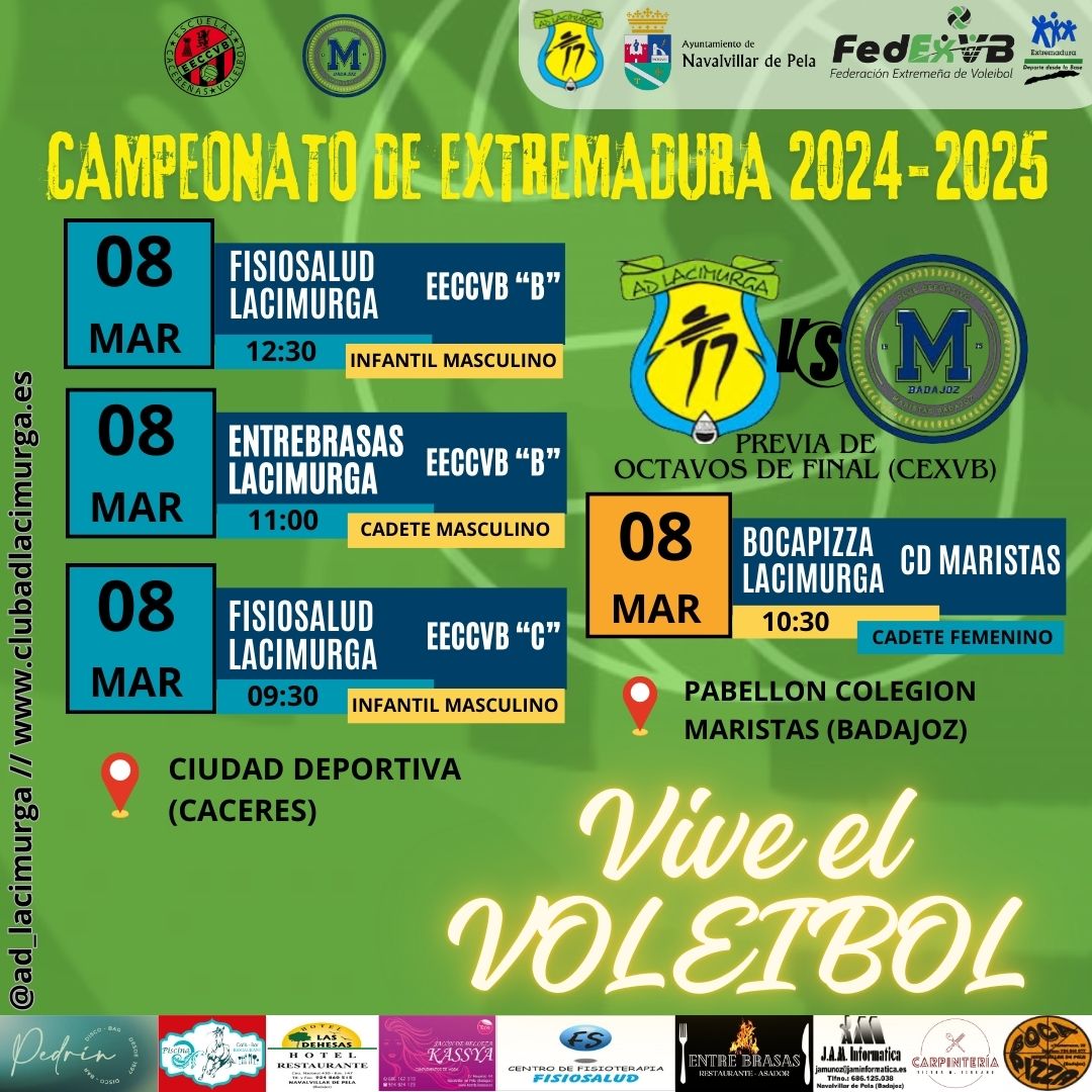 En la sección femenina nuestro equipo BOCAPIZZA LACIMURGA se desplazara la la ciudad de Badajoz para enfrentarse a CD Maristas en un partido de previas de Octavos de Final del Campeonato de Extremadura.