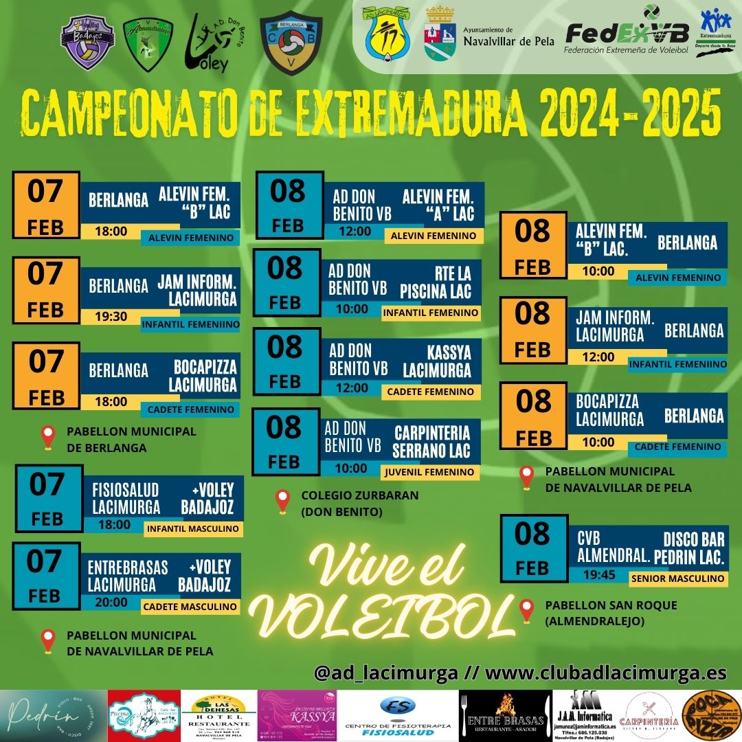 El próximo fin de semana continuamos con la liga regular, en esta ocasión acogeremos en nuestra localidad, Navalvillar de Pela , en la tarde del viernes a + VOLEY BADAJOZ que se enfrentara a nuestros equipos FISIOSALUD LACIMURGA y ENTREBRASAS LACIMURGA. Por otro lado, nuestros equipos de 2ª división JUDEX ALEVIN "B" LACIMURGA, JAM INFORMATICA LACIMURGA y BOCAPIZZA LACIMURGA, se desplazarán a Berlanga para disputar el partido aplazado del 18 de enero.