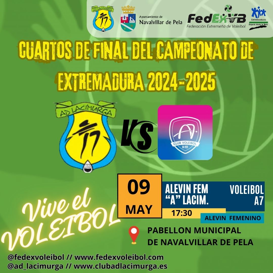 Seguimos y vamos llegando a la recta final en esta categoría tambien, este fin de semana disputaremos un encuentro de CUARTOS DE FINAL ALEVIN FEMENINO DEL CAMPEONATO DE EXTREMADURA DE VOLEIBOL , en el cual se pelearan por un puesto en la fase final nuestro ALEVIN FEMENINO "A" LACIMURGA contra VOLEIBOL A7, este partido se disputara en la tarde del viernes, no te lo puedes perder.