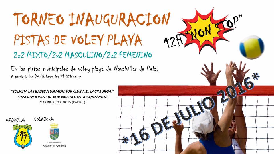 El próximo día 12 de Agosto de 2017, a partir de las 09:00 horas, tendrá lugar el "II OPEN SENIOR DE VOLEY PLAYA MASCULINO Y FEMENINO" en la localidad de Navalvillar de Pela, organizado por el Club A.D. Lacimurga con apoyo de la Federación Extremeña de Voleibol, el Excmo. Ayuntamiento de Navalvillar de Pela, la Excma. Diputación Provincial de Badajoz, la Dirección General de Deportes, Centro de Fisioterapia Fisiosalud y A.J. Fair Play. Dicha prueba será puntuable para el Ranking Nacional de Voley Playa y está incluida en el circuito de Voley Playa de la Federación Extremeña de Voleibol.